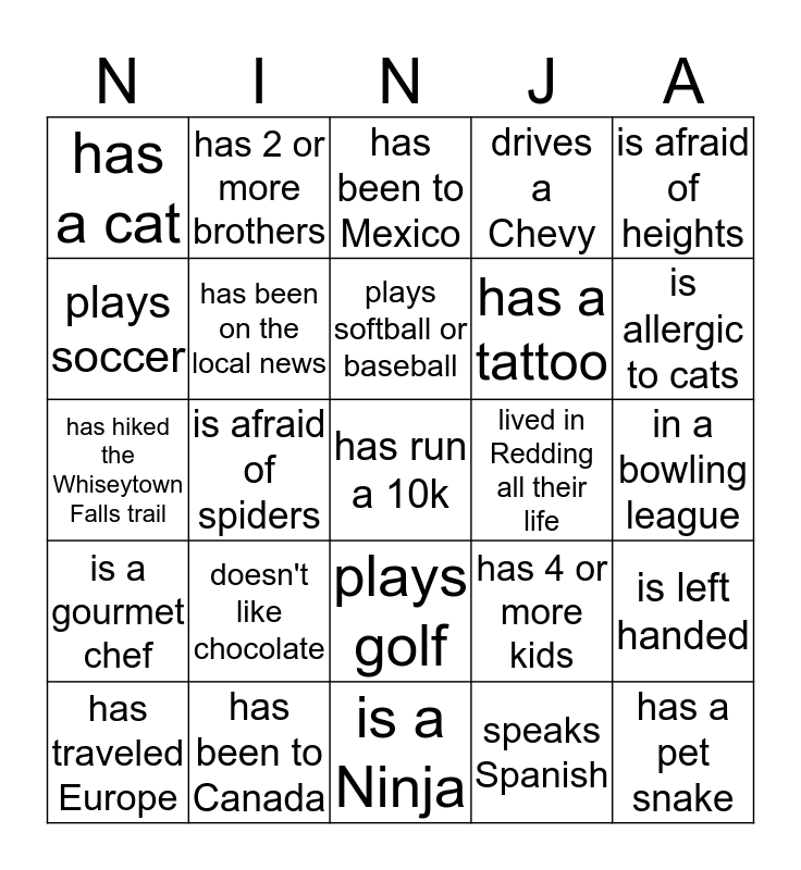 This bingo card has a free space and 24 words: doesn't like chocolate, has been to Canada, plays softball or baseball, has traveled Europe, is afraid of heights, has a cat, plays soccer, has 2 or more brothers, lived in Redding all their life, plays golf, has a tattoo, has hiked the Whiseytown Falls trail, has 4 or more kids, is left handed, has been on the local news, speaks Spanish, in a bowling league, has been to Mexico, is allergic to cats, is afraid of spiders, has a pet snake, is a gourmet chef, drives a Chevy and is a Ninja.