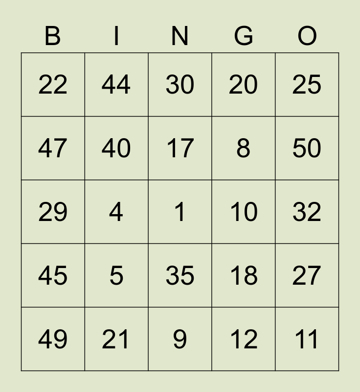 This bingo card has a free space and 24 words: 5, 21, 17, 49, 25, 22, 47, 44, 10, 35, 8, 29, 18, 27, 40, 12, 32, 30, 50, 4, 11, 45, 20 and 9.