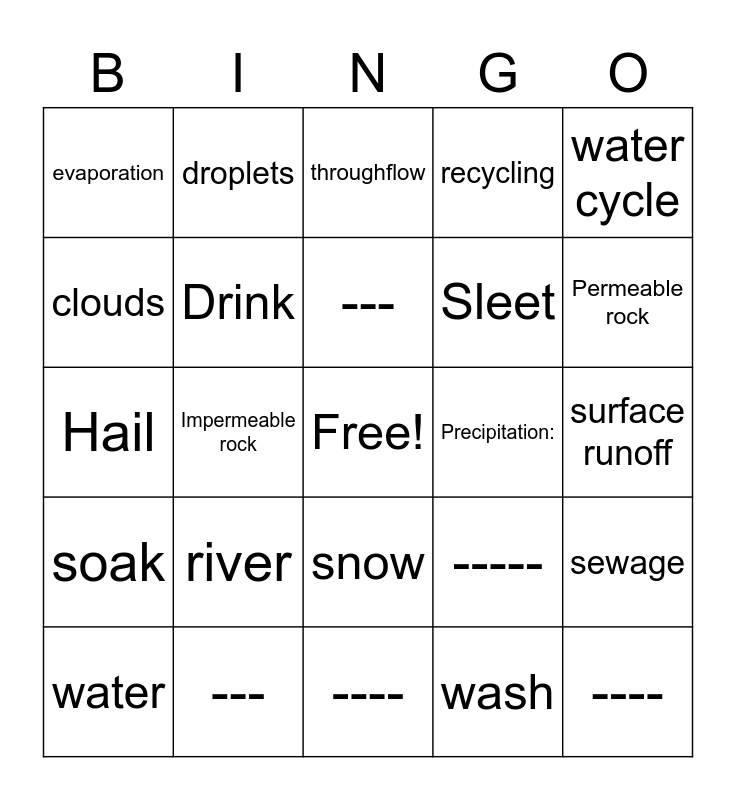 This bingo card has a free space and 24 words: river, ---, ---, water, water cycle, evaporation, clouds, droplets, Precipitation:, snow, Sleet, Hail, -----, sewage, Drink, wash, surface runoff, throughflow, Permeable rock, Impermeable rock, ----, soak, recycling and ----.