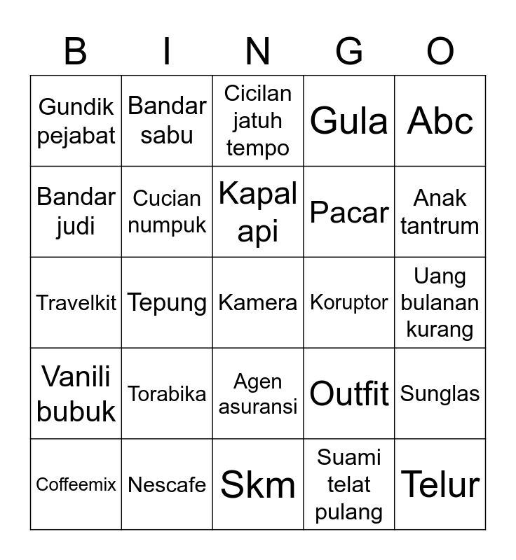 This bingo card has a free space and 24 words: Torabika, Nescafe, Kapal api, Coffeemix, Abc, Gundik pejabat, Bandar judi, Bandar sabu, Koruptor, Agen asuransi, Pacar, Travelkit, Outfit, Sunglas, Cucian numpuk, Suami telat pulang, Uang bulanan kurang, Cicilan jatuh tempo, Anak tantrum, Tepung, Telur, Vanili bubuk, Gula and Skm.