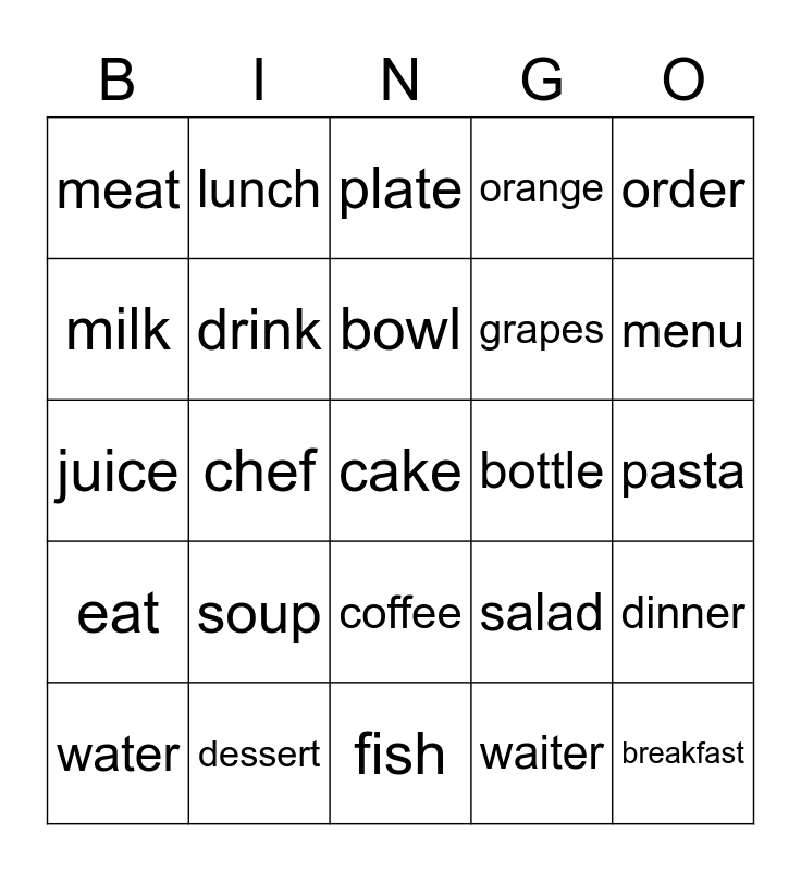 This bingo card has 32 words: waiter, waitress, chef, customer, eat, drink, order, dinner, lunch, breakfast, bowl, plate, cup, glass, bottle, wine, water, juice, coffee, soup, salad, pizza, pasta, dessert, cake, orange, grapes, milk, meat, fish, uniform and menu.