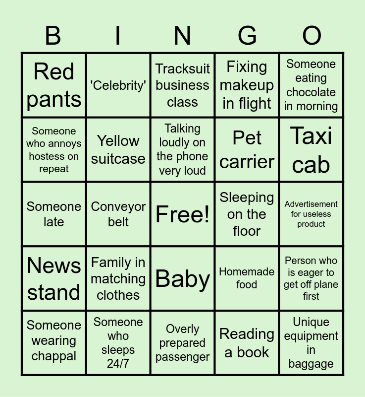 This bingo card has a free space and 24 words: Someone wearing chappal, Family in matching clothes, Talking loudly on the phone very loud, Reading a book, Someone eating chocolate in morning, Red pants, 'Celebrity', Tracksuit business class, Sleeping on the floor, Advertisement for useless product, Someone late, Yellow suitcase, Homemade food, Person who is eager to get off plane first, Someone who annoys hostess on repeat, Someone who sleeps 24/7, Overly prepared passenger, Fixing makeup in flight, Taxi cab, News stand, Conveyor belt, Baby, Pet carrier and Unique equipment in baggage.