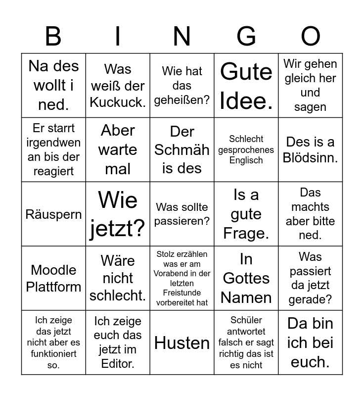 This bingo card has 36 words: Free!, In Wirklichkeit, Entschuldigung, Aber warte mal, In Gottes Namen, Moodle Plattform, Der Schmäh is des, Nennen wir’s vielleicht, Wir gehen gleich her und sagen, Glaub i a., Wie jetzt?, Gute Idee., Notebooks zu., Is a gute Frage., Des is a Blödsinn., Na des wollt i ned., Da bin ich bei euch., Wäre nicht schlecht., Was sollte passieren?, Wie hat das geheißen?, Das machts aber bitte ned., Was passiert da jetzt gerade?, Ich zeige euch das jetzt im Editor., Ich zeige das jetzt nicht aber es funktioniert so., Husten, Was weiß der Kuckuck., Räuspern, Er verschreibt sich, Schlecht gesprochenes Englisch, Er starrt irgendwen an bis der reagiert, Nicht verwendete Autovervollständigung, Stoppt mitten im Satz um ein Wort zu suchen, Schüler antwortet falsch er sagt richtig das ist es nicht, Stolz erzählen was er am Vorabend in der letzten Freistunde vorbereitet hat, Sebi stellt ihn infrage and Adrian löst den Fehler.
