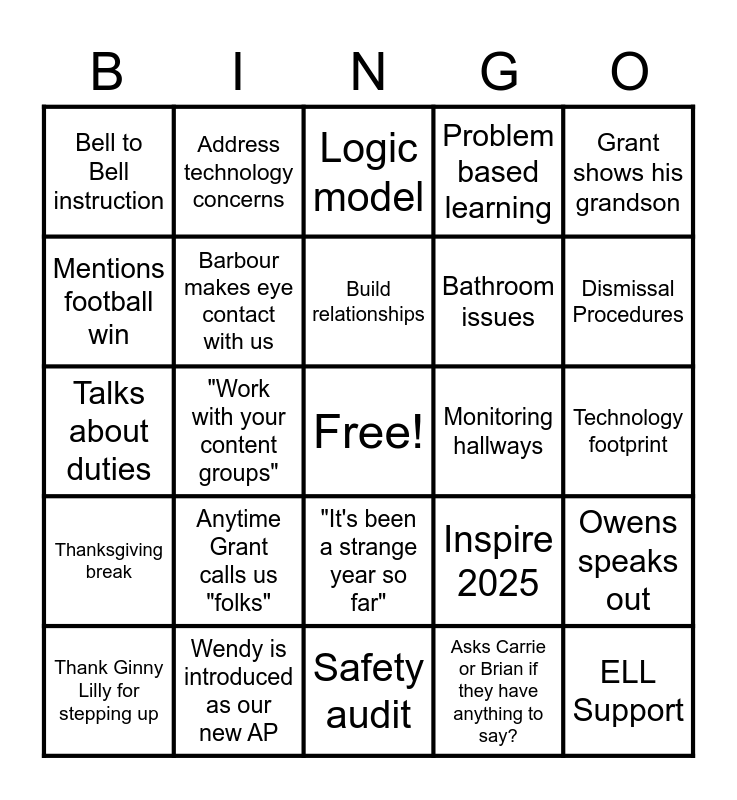 This bingo card has a free space and 24 words: Anytime Grant calls us "folks", Wendy is introduced as our new AP, Build relationships, Thank Ginny Lilly for stepping up, Grant shows his grandson, Bell to Bell instruction, Mentions football win, Address technology concerns, Monitoring hallways, "It's been a strange year so far", Bathroom issues, Talks about duties, Inspire 2025, Owens speaks out, Barbour makes eye contact with us, Asks Carrie or Brian if they have anything to say?, Technology footprint, Logic model, Dismissal Procedures, "Work with your content groups", ELL Support, Thanksgiving break, Problem based learning and Safety audit.