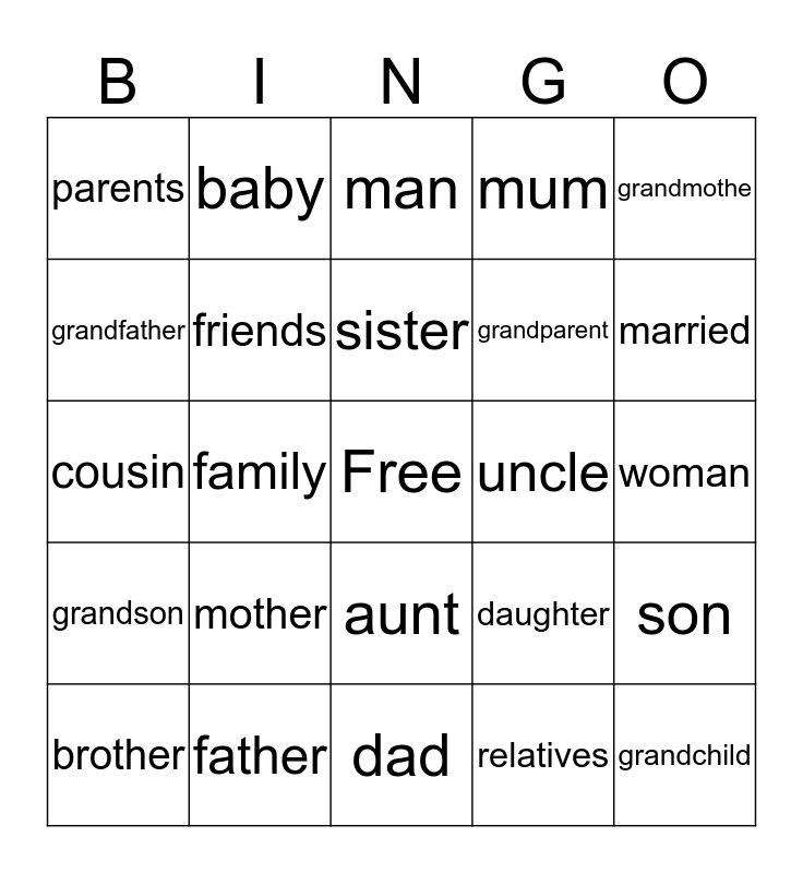 This bingo card has a free space and 24 words: mother, father, sister, brother, grandmothe, parents, grandfather, baby, uncle, aunt, grandparent, cousin, daughter, son, friends, relatives, woman, man, married, family, grandchild, grandson, mum and dad.