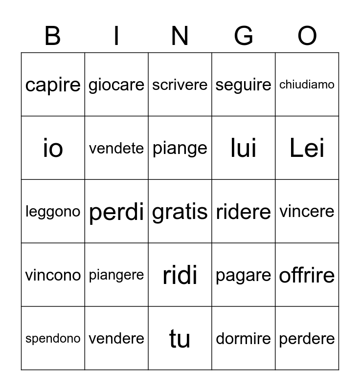 This bingo card has a free space and 39 words: pulisco, guardiamo, giochi, vendete, spendono, ridi, piange, finiscono, chiudiamo, vincono, perdi, seguire, perdere, vincere, ridere, piangere, aprire, capire, capisco, pagare, io, tu, lui, Lei, noi, voi, loro, dimenticare, cercare, giocare, pagare, leggere, scrivere, vendere, dormire, partire, offrire, leggono and anna ed io / ballare.