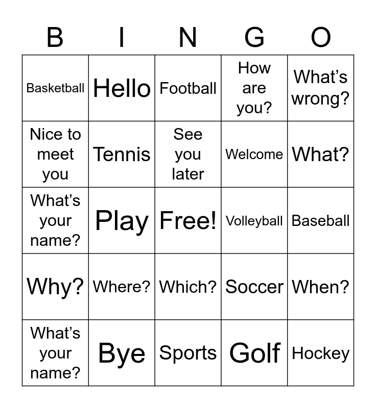 This bingo card has a free space and 31 words: Sports, Game, Play, Team, Basketball, Football, Tennis, Soccer, Volleyball, Golf, Baseball, Hockey, Win, Lose, What?, How?, When?, Where?, Why?, Which?, What’s wrong?, How are you?, What’s your name?, Hello, Welcome, Nice to meet you, How are you?, What’s your name?, Bye, See you later and See you soon.