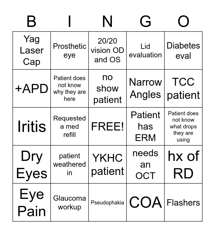 This bingo card has a free space and 29 words: Eye Pain, Late patient, Requested a med refill, Floaters, Yag Laser Cap, 20/20 vision OD and OS, Patient does not know why they are here, patient weathered in, Patient has ERM, Glaucoma workup, Patient does not know what drops they are using, Flashers, Pseudophakia, COA, TCC patient, NSHC patient, YKHC patient, Dry Eyes, Diabetes eval, Iritis, needs an OCT, HCQ eval, Narrow Angles, +APD, Lid evaluation, Prosthetic eye, hx of RD, no show patient and BBAHC patient.