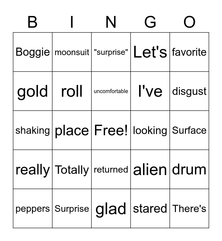 This bingo card has a free space and 24 words: Totally, Surprise, uncomfortable, peppers, favorite, Boggie, gold, moonsuit, looking, returned, I've, shaking, alien, drum, roll, stared, Surface, "surprise", disgust, place, There's, really, Let's and glad.