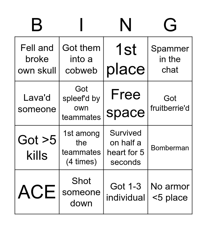 This bingo card has 16 words: Shot someone down, Bomberman, 1st place, Fell and broke own skull, Got >5 kills, Got them into a cobweb, Survived on half a heart for 5 seconds, Got 1-3 individual, Lava'd someone, Got spleef'd by own teammates, ACE, Spammer in the chat, 1st among the teammates (4 times), Got fruitberrie'd, Free space and No armor <5 place.