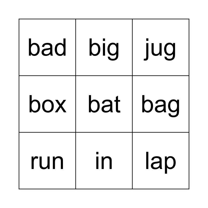 This bingo card has 25 words: us, up, in, it, bat, bad, bag, big, bed, bug, lap, lid, rat, red, run, web, wig, jug, jam, yak, yes, kin, kid, box and wax.