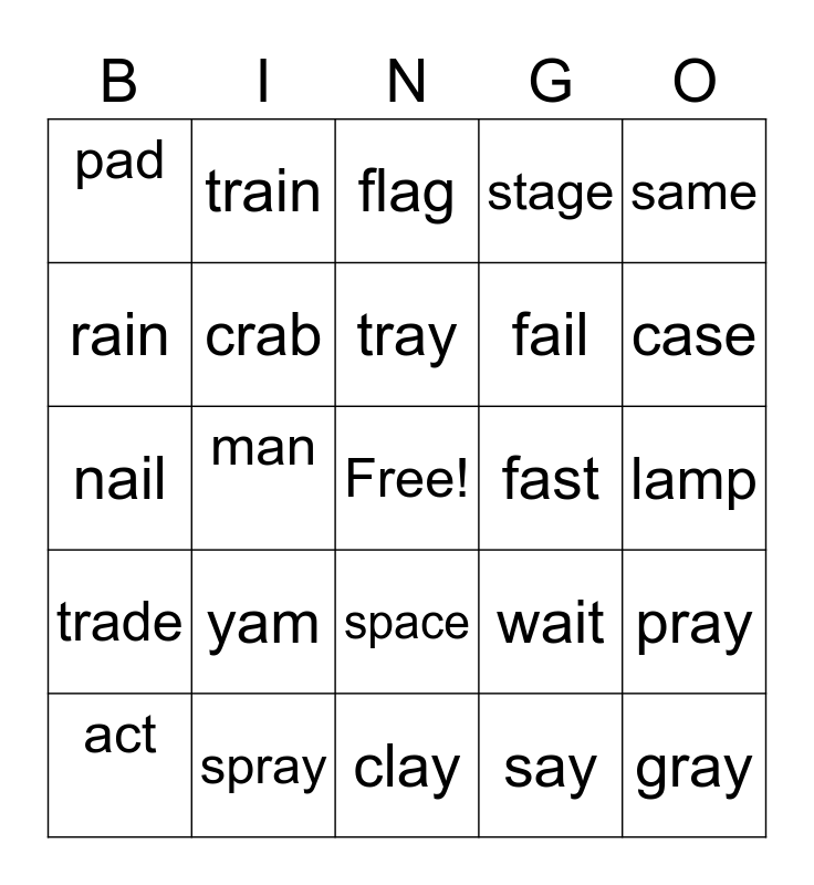 This bingo card has a free space and 29 words: act, cap, man, sat, pad, flag, crab, yam, fast, spray, lamp, gray, clay, say, case, shade, space, trade, same, nail, wait, maid, fail, rain, stage, train, pray, tray and plane.
