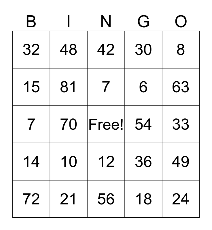 This bingo card has a free space and 24 words: 10, 21, 7, 72, 8, 32, 15, 48, 54, 12, 6, 7, 36, 49, 81, 18, 33, 42, 63, 70, 24, 14, 30 and 56.