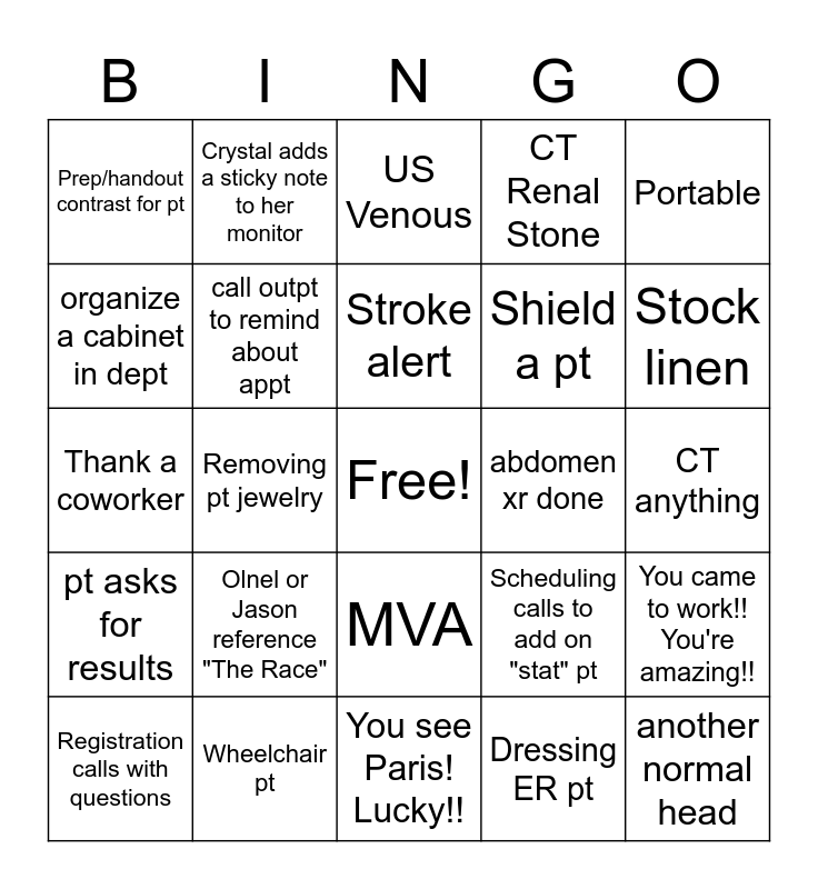 This bingo card has a free space and 35 words: Burn a CD, Help a coworker, broken extremity, call outpt to remind about appt, MVA, CT Renal Stone, organize a cabinet in dept, CTA chest, Stroke alert, Peds pt, Thank a coworker, Portable, Pt over 80 yrs old, more than 2 exams on 1 pt, Prep/handout contrast for pt, abdomen xr done, Dressing ER pt, Removing pt jewelry, pt asks for results, another normal head, Scheduling calls to add on "stat" pt, Registration calls with questions, You came to work!! You're amazing!!, Wheelchair pt, US Venous, Stock linen, Child Screaming, Crystal deep breathes, Shield a pt, CT anything, XR anything, You see Paris! Lucky!!, Olnel or Jason reference "The Race", Crystal adds a sticky note to her monitor and You clocked in!!.