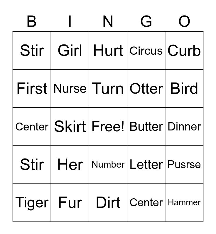 This bingo card has a free space and 24 words: Her, Fur, Turn, Tiger, Curb, Stir, First, Girl, Butter, Number, Otter, Center, Letter, Pusrse, Nurse, Center, Dinner, Hurt, Bird, Skirt, Hammer, Stir, Circus and Dirt.