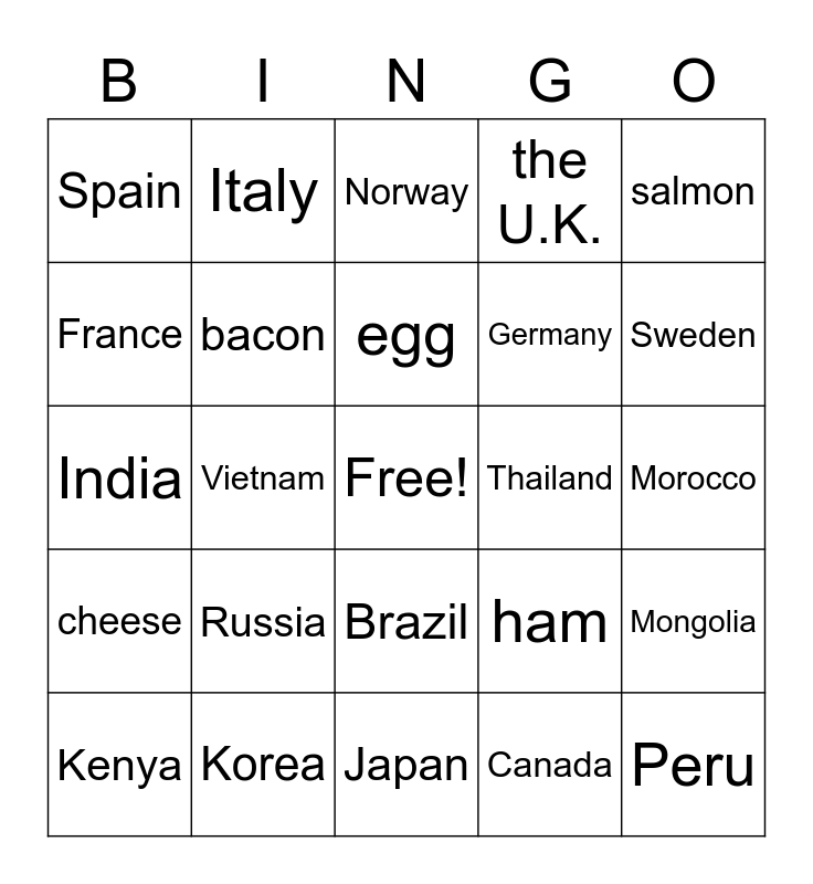 This bingo card has a free space and 36 words: beef, chicken, pork, bacon, ham, cheese, egg, fish, salmon, octopus, Vietnam, the U.K., Turkey, Thailand, Sweden, Spain, Singapore, Russia, Peru, Norway, Morocco, Mongolia, Korea, Kenya, Japan, Italy, India, Ghana, Germany, France, Egypt, China, Canada, Brazil, Australia and America.