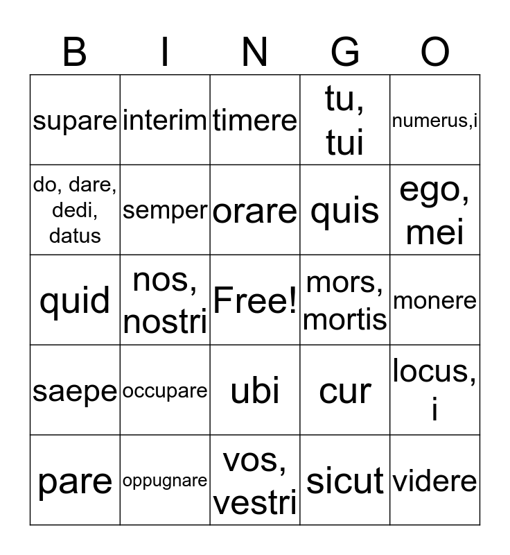 This bingo card has a free space and 24 words: occupare, oppugnare, orare, pare, numerus,i, supare, do, dare, dedi, datus, interim, mors, mortis, ubi, quis, quid, cur, locus, i, semper, sicut, monere, timere, ego, mei, nos, nostri, videre, saepe, tu, tui and vos, vestri.