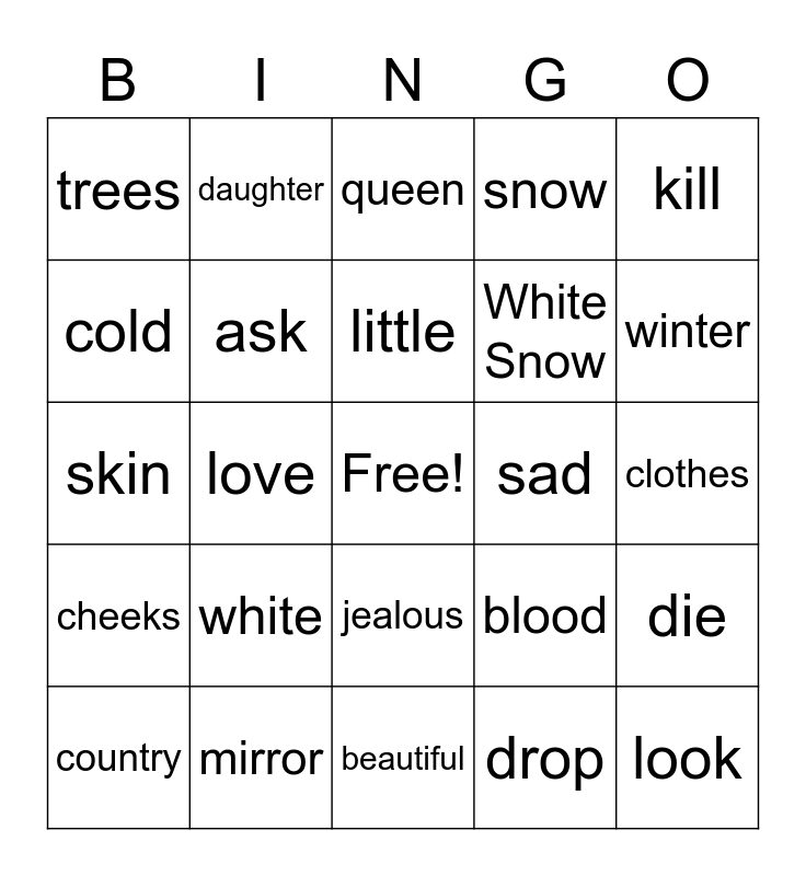This bingo card has a free space and 27 words: blood, needle, White Snow, beautiful, cold, queen, daughter, cheeks, sad, die, skin, snow, country, mirror, winter, unkind, ask, little, white, trees, clothes, drop, love, look, jealous, kill and listen.