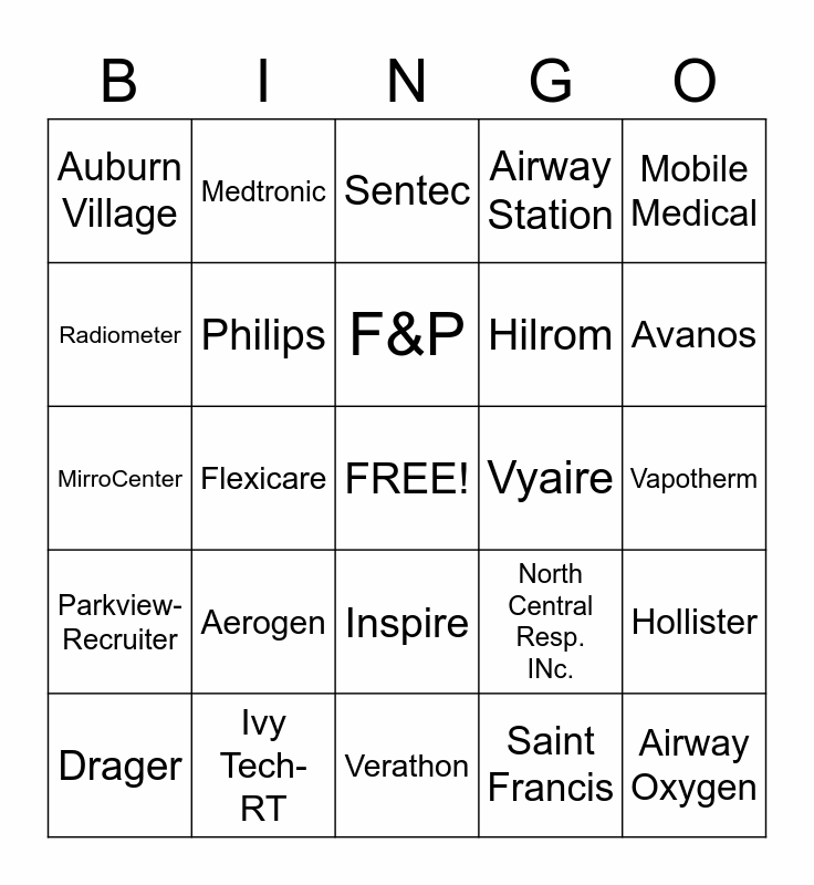 This bingo card has a free space and 24 words: Aerogen, Ivy Tech-RT, F&P, Drager, Mobile Medical, Auburn Village, Radiometer, Medtronic, Vyaire, Inspire, Hilrom, MirroCenter, North Central Resp. INc., Hollister, Philips, Saint Francis, Vapotherm, Sentec, Avanos, Flexicare, Airway Oxygen, Parkview-Recruiter, Airway Station and Verathon.