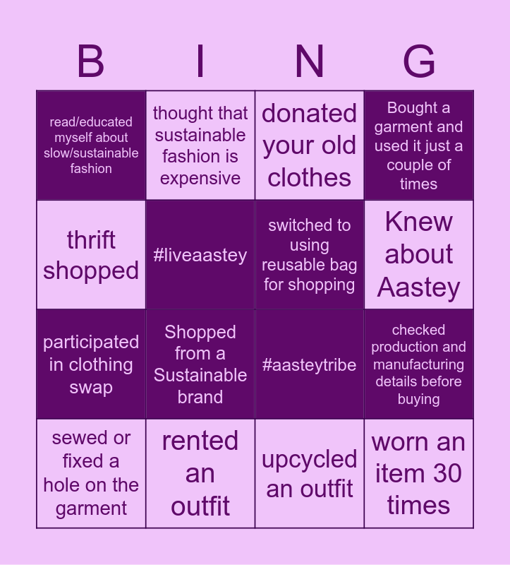 This bingo card has 16 words: rented an outfit, checked production and manufacturing details before buying, donated your old clothes, read/educated myself about slow/sustainable fashion, participated in clothing swap, thought that sustainable fashion is expensive, #aasteytribe, upcycled an outfit, thrift shopped, #liveaastey, sewed or fixed a hole on the garment, Bought a garment and used it just a couple of times, Shopped from a Sustainable brand, Knew about Aastey, switched to using reusable bag for shopping and worn an item 30 times.