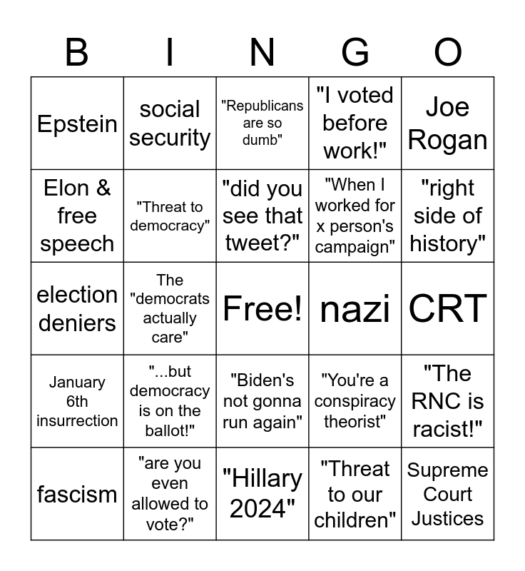 This bingo card has a free space and 24 words: "...but democracy is on the ballot!", "are you even allowed to vote?", "did you see that tweet?", fascism, Joe Rogan, Epstein, Elon & free speech, social security, nazi, "Biden's not gonna run again", "When I worked for x person's campaign", election deniers, "You're a conspiracy theorist", "The RNC is racist!", "Threat to democracy", "Threat to our children", CRT, "Republicans are so dumb", "right side of history", The "democrats actually care", Supreme Court Justices, January 6th insurrection, "I voted before work!" and "Hillary 2024".
