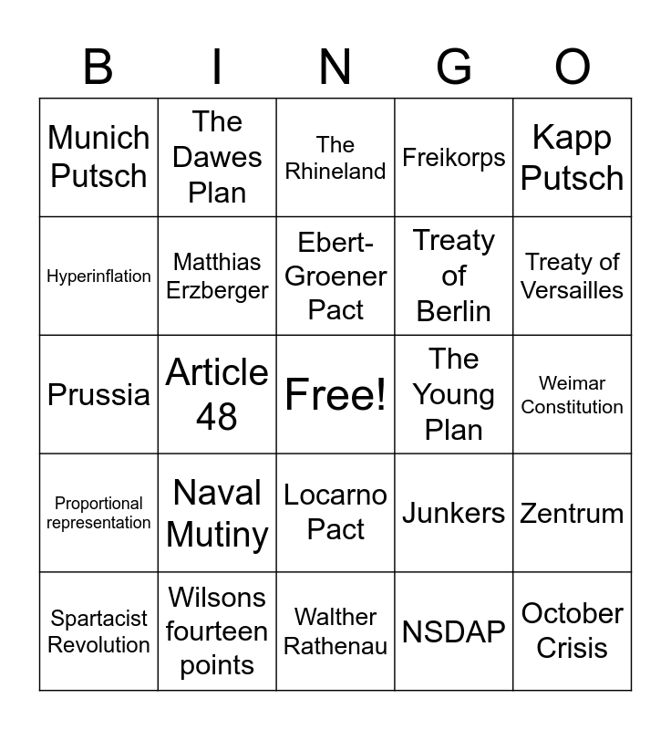 This bingo card has a free space and 24 words: Naval Mutiny, Wilsons fourteen points, Ebert-Groener Pact, Spartacist Revolution, Kapp Putsch, Munich Putsch, Hyperinflation, The Dawes Plan, The Young Plan, Locarno Pact, Treaty of Berlin, Prussia, Junkers, Zentrum, Matthias Erzberger, NSDAP, Weimar Constitution, The Rhineland, Treaty of Versailles, Article 48, October Crisis, Proportional representation, Freikorps and Walther Rathenau.