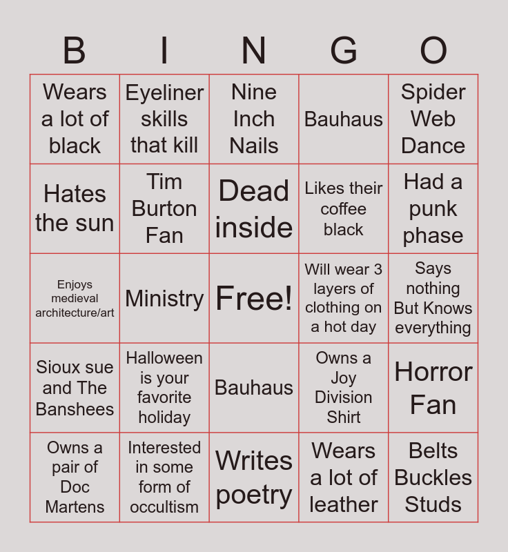 This bingo card has a free space and 27 words: Owns a Joy Division Shirt, Knows Hot Topic isn't Goth, Likes their coffee black, Writes poetry, Hates the sun, Nine Inch Nails, Eyeliner skills that kill, Sioux sue and The Banshees, Will wear 3 layers of clothing on a hot day, Horror Fan, Enjoys medieval architecture/art, Bauhaus, Owns a pair of Doc Martens, Interested in some form of occultism, Had a punk phase, Takes graveyard selfies, Tim Burton Fan, Dead inside, Halloween is your favorite holiday, Wears a lot of black, Says nothing But Knows everything, Wears a lot of leather, Ministry, Belts Buckles Studs, Bauhaus, Spider Web Dance and Rings and things.