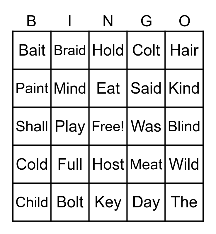 This bingo card has a free space and 24 words: Child, Full, Eat, Day, Hair, Bait, Braid, Hold, Was, Blind, Shall, Mind, Meat, Wild, Paint, Bolt, Key, Colt, Kind, Cold, Play, Host, Said and The.