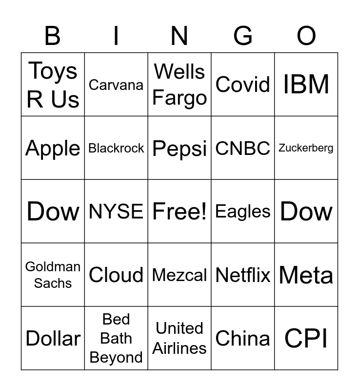 This bingo card has a free space and 24 words: Cloud, Bed Bath Beyond, Pepsi, Dollar, IBM, Toys R Us, Apple, Carvana, Eagles, Mezcal, CNBC, Dow, Netflix, Meta, Blackrock, China, Dow, Wells Fargo, Zuckerberg, NYSE, CPI, Goldman Sachs, Covid and United Airlines.