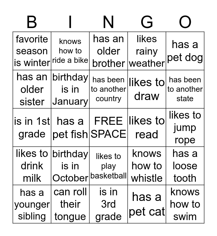 This bingo card has a free space and 24 words: birthday is in October, can roll their tongue, has been to another country, has a younger sibling, has a pet dog, favorite season is winter, has an older sister, knows how to ride a bike, likes to read, likes to play basketball, likes to draw, is in 1st grade, knows how to whistle, has a loose tooth, birthday is in January, has a pet cat, likes to jump rope, has an older brother, has been to another state, has a pet fish, knows how to swim, likes to drink milk, likes rainy weather and is in 3rd grade.