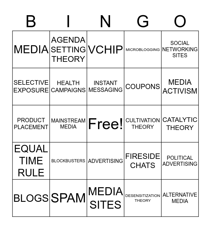This bingo card has a free space and 24 words: BLOCKBUSTERS, SPAM, INSTANT MESSAGING, BLOGS, SOCIAL NETWORKING SITES, MEDIA, SELECTIVE EXPOSURE, AGENDA SETTING THEORY, CULTIVATION THEORY, ADVERTISING, COUPONS, PRODUCT PLACEMENT, FIRESIDE CHATS, POLITICAL ADVERTISING, HEALTH CAMPAIGNS, DESENSITIZATION THEORY, CATALYTIC THEORY, VCHIP, MEDIA ACTIVISM, MAINSTREAM MEDIA, ALTERNATIVE MEDIA, EQUAL TIME RULE, MICROBLOGGING and MEDIA SITES.