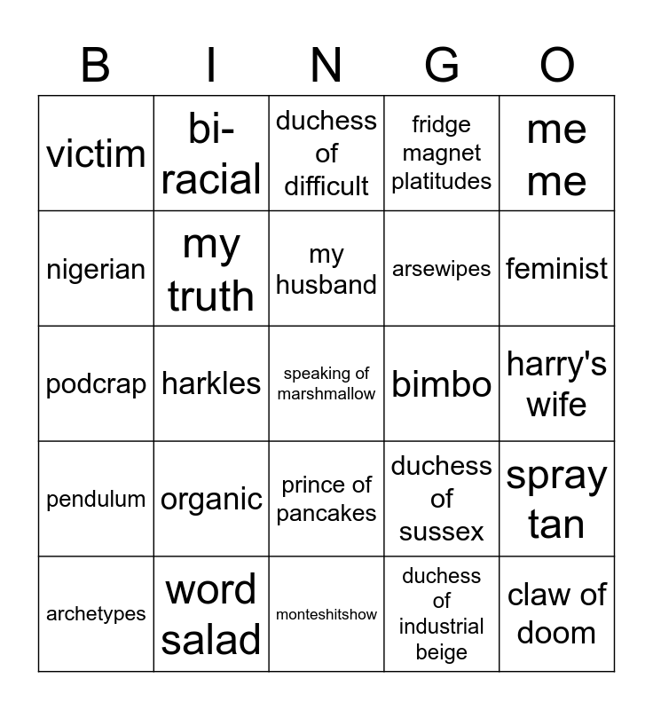 This bingo card has 25 words: organic, monteshitshow, my husband, archetypes, me me, victim, nigerian, bi-racial, bimbo, prince of pancakes, arsewipes, podcrap, duchess of sussex, spray tan, my truth, claw of doom, harry's wife, duchess of difficult, feminist, harkles, speaking of marshmallow, word salad, pendulum, fridge magnet platitudes and duchess of industrial beige.