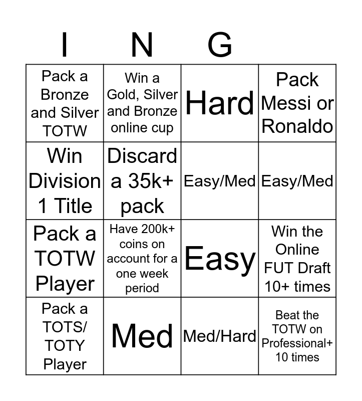 This bingo card has a free space and 15 words: Pack a TOTS/ TOTY Player, Beat the TOTW on Professional+ 10 times, Hard, Pack a Bronze and Silver TOTW, Easy/Med, Win Division 1 Title, Have 200k+ coins on account for a one week period, Med/Hard, Discard a 35k+ pack, Pack a TOTW Player, Win the Online FUT Draft 10+ times, Pack Messi or Ronaldo, Easy/Med, Win a Gold, Silver and Bronze online cup and Med.