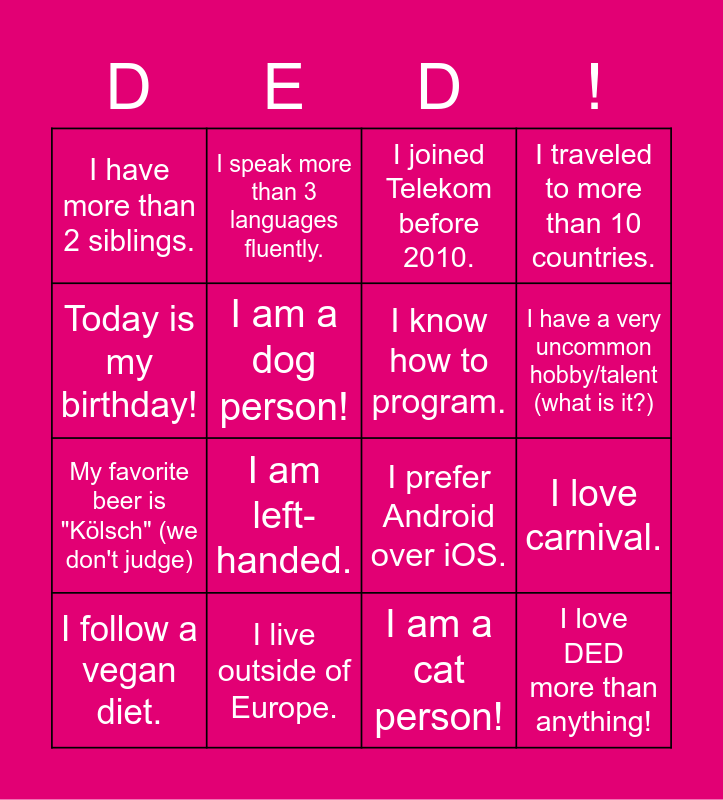 This bingo card has 16 words: I follow a vegan diet., I live outside of Europe., I joined Telekom before 2010., I traveled to more than 10 countries., Today is my birthday!, I speak more than 3 languages fluently., I prefer Android over iOS., I love carnival., I have more than 2 siblings., I am a dog person!, I am a cat person!, I have a very uncommon hobby/talent (what is it?), My favorite beer is "Kölsch" (we don't judge), I am left-handed., I know how to program. and I love DED more than anything!.