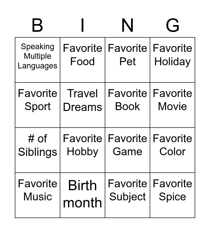This bingo card has 16 words: Birth month, Favorite Color, Favorite Pet, Speaking Multiple Languages, # of Siblings, Favorite Food, Favorite Game, Favorite Subject, Favorite Sport, Travel Dreams, Favorite Music, Favorite Holiday, Favorite Hobby, Favorite Movie, Favorite Book and Favorite Spice.