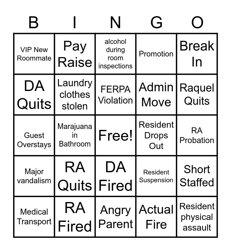 This bingo card has a free space and 29 words: Medical Transport, Tower Evacuates, Marajuana in Bathroom, Lobby Evac 2am, VIP New Roommate, alcohol during room inspections, Laundry clothes stolen, RA Quits, Resident Drops Out, RA Fired, RA Probation, Resident physical assault, Angry Parent, Actual Fire, Raquel Quits, Angry Resident, DA Fired, Major vandalism, Break In, Guest Overstays, Resident Suspension, Missing resident, Admin Move, DA Quits, Promotion, Pay Raise, Short Staffed, FERPA Violation and Guest Sneaks In.