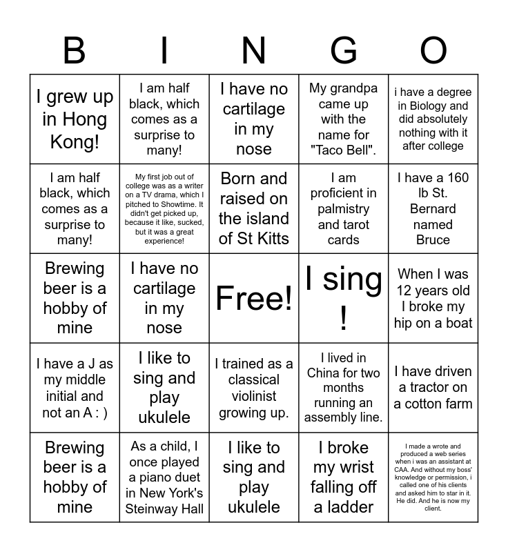 This bingo card has a free space and 124 words: I never learned to ride a bike, I enjoy cooking, I was the drummer for my College's Musical Theater Band!, actual favorite food is Goldfish & I've never seen The Lion King or Titanic., I helped 3,000 students get into college, I trained as a classical violinist growing up., I have a J as my middle initial and not an A : ), When I was 12 years old I broke my hip on a boat, I broke my wrist falling off a ladder, I've had 4 different citizenships in my lifetime, I have 2 first names, I am career driven, I am huge country music fan, I love traveling and have been to Europe a number of times., My high school drum line marched in the NYC St. Patrick's Day Parade, but one year we ran out of drums, so I played the cowbell for 30 blocks on 5th Ave., My grandmother was part of the team at Bletchley park that broke the Enigma code in WW2, I played violin for 10 years in a classical Persian orchestra, I’ve lived in 8 different cities and 3 countries., As a child, I once played a piano duet in New York's Steinway Hall, Rob Whittel and I went to the same high school and his mom taught my Spanish Class, One of my favorite hobbies is stand up paddle boarding., I love the piano, Me and my sister used to run the Quiet Riot fan club in the early '80., Brewing beer is a hobby of mine, My first job out of college was as a writer on a TV drama, which I pitched to Showtime. It didn't get picked up, because it like, sucked, but it was a great experience!, previous Team USA figure skater, I am a dual citizen of the US and Germany., Born and raised on the island of St Kitts, My grandpa came up with the name for "Taco Bell"., I was a division 1 college diver for a year., I was born in The Bahamas, grew up in Jamaica, have a Haitian last name but my dad is from The Turks Cacois Islands. I am a true representation of Miss Caribbean!, I am a small business owner-- I create merch for sororities and fraternities, I have driven a tractor on a cotton farm, My mother's government name is Kim Jong Un, I have no cartilage in my nose, I like to sing and play ukulele, I was inexplicably responsible for AV at the Second Annual Range Retreat, if I wasn't a representative, I would be a coach/teacher, I'm left-handed, I made a wrote and produced a web series when i was an assistant at CAA. And without my boss' knowledge or permission, i called one of his clients and asked him to star in it. He did. And he is now my client., I am terrified and have never been on a roller coaster of any size, shape or form., I lived in China for two months running an assembly line., I grew up in Hong Kong!, I am ridiculously talented at Ping-Pong, Produced a feature doc about real men around the world named James Bond, I was trained as a biochemist and I took a night school degree in archaeology., got sick from dirty drinking water teaching in fiji first semester study abroad. started an initiative to promote sustainable water practices for third world countries, I have a 160 lb St. Bernard named Bruce, Darby throws a birthday party for her dog, Duke every year, complete with merch, cake, and sometimes kegs of beer. It's called Dukefest., i have a degree in Biology and did absolutely nothing with it after college, i wrote a book that i keep in the trunk of my car, I'm 100% Greek, I ran the Los Angeles Marathon, I have a photographic memory!, I have a cameo in Justin Bieber's film "Never Say Never", When I had COVID, I shut down the most popular sandwich shop in my area, i was trained as a classical pianist for 15 years, I fostered 12 dogs during the first year of the pandemic, I am proficient in palmistry and tarot cards, I learned to juggle when I was 9., My karoke song is 'Justified & Ancient', I sing !, I am half black, which comes as a surprise to many!, I was captain of my high school Quiz Bowl team. We won state my junior year!, I never learned to ride a bike, I enjoy cooking, I was the drummer for my College's Musical Theater Band!, actual favorite food is Goldfish & I've never seen The Lion King or Titanic., I helped 3,000 students get into college, I trained as a classical violinist growing up., I have a J as my middle initial and not an A : ), When I was 12 years old I broke my hip on a boat, I broke my wrist falling off a ladder, I've had 4 different citizenships in my lifetime, I have 2 first names, I am career driven, I am huge country music fan, I love traveling and have been to Europe a number of times., My high school drum line marched in the NYC St. Patrick's Day Parade, but one year we ran out of drums, so I played the cowbell for 30 blocks on 5th Ave., My grandmother was part of the team at Bletchley park that broke the Enigma code in WW2, I played violin for 10 years in a classical Persian orchestra, I’ve lived in 8 different cities and 3 countries., As a child, I once played a piano duet in New York's Steinway Hall, Rob Whittel and I went to the same high school and his mom taught my Spanish Class, One of my favorite hobbies is stand up paddle boarding., I love the piano, Me and my sister used to run the Quiet Riot fan club in the early '80., Brewing beer is a hobby of mine, My first job out of college was as a writer on a TV drama, which I pitched to Showtime. It didn't get picked up, because it like, sucked, but it was a great experience!, previous Team USA figure skater, I am a dual citizen of the US and Germany., Born and raised on the island of St Kitts, My grandpa came up with the name for "Taco Bell"., I was a division 1 college diver for a year., I was born in The Bahamas, grew up in Jamaica, have a Haitian last name but my dad is from The Turks Cacois Islands. I am a true representation of Miss Caribbean!, I am a small business owner-- I create merch for sororities and fraternities, I have driven a tractor on a cotton farm, My mother's government name is Kim Jong Un, I have no cartilage in my nose, I like to sing and play ukulele, I was inexplicably responsible for AV