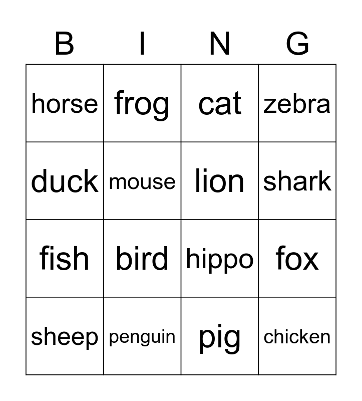 This bingo card has 28 words: monkey, parrot, fish, cow, mouse, cat, frog, chicken, penguin, snake, hippo, zebra, whale, crocodile, bird, tiger, spider, lion, shark, dog, horse, rat, sheep, fox, pig, bear, duck and dolphin.