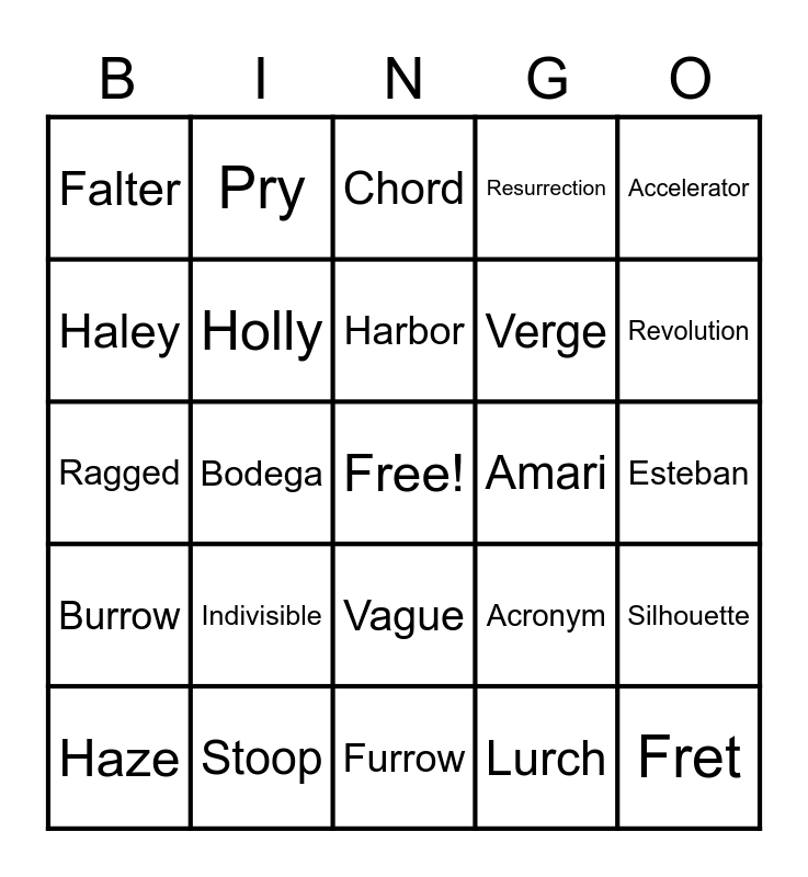 This bingo card has a free space and 24 words: Indivisible, Stoop, Harbor, Haze, Accelerator, Falter, Haley, Pry, Amari, Vague, Verge, Ragged, Acronym, Silhouette, Holly, Lurch, Esteban, Chord, Revolution, Bodega, Fret, Burrow, Resurrection and Furrow.