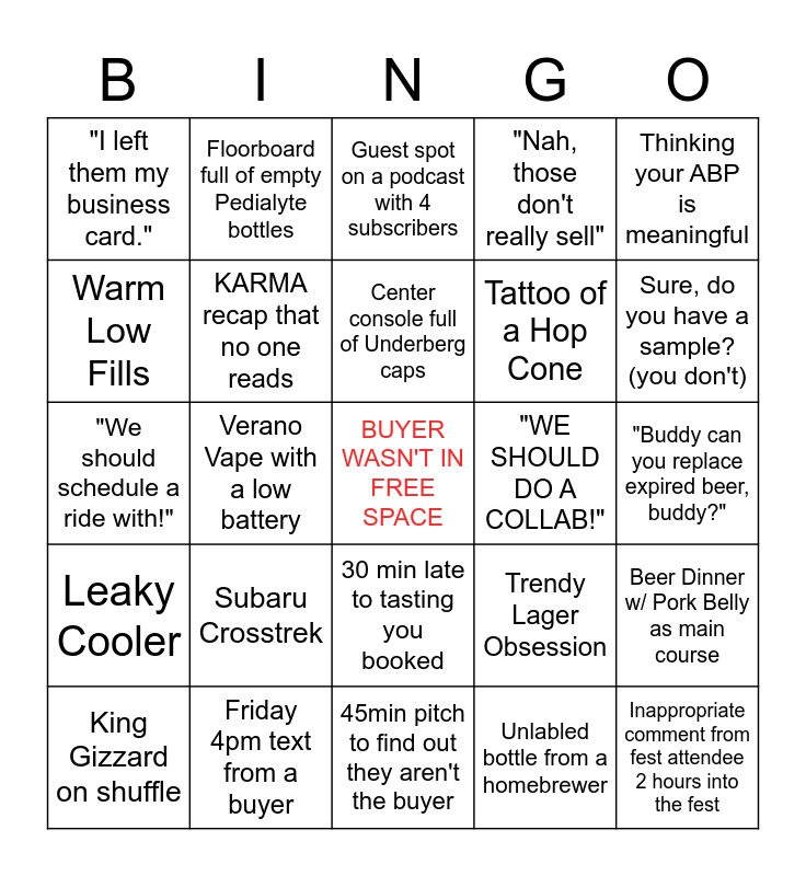 This bingo card has a free space and 24 words: Subaru Crosstrek, Friday 4pm text from a buyer, Center console full of Underberg caps, King Gizzard on shuffle, Thinking your ABP is meaningful, "I left them my business card.", Warm Low Fills, Floorboard full of empty Pedialyte bottles, "WE SHOULD DO A COLLAB!", 30 min late to tasting you booked, Tattoo of a Hop Cone, "We should schedule a ride with!", Trendy Lager Obsession, Beer Dinner w/ Pork Belly as main course, KARMA recap that no one reads, Unlabled bottle from a homebrewer, "Buddy can you replace expired beer, buddy?", Guest spot on a podcast with 4 subscribers, Sure, do you have a sample? (you don't), Verano Vape with a low battery, Inappropriate comment from fest attendee 2 hours into the fest, Leaky Cooler, "Nah, those don't really sell" and 45min pitch to find out they aren't the buyer.
