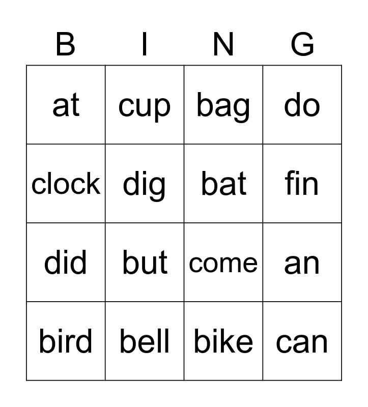 This bingo card has 30 words: a, am, an, and, at, bag, bat, bed, bell, big, bike, bird, bug, bus, but, by, cake, can, cat, clock, come, crib, cup, did, dig, do, dog, fan, fin and flag.