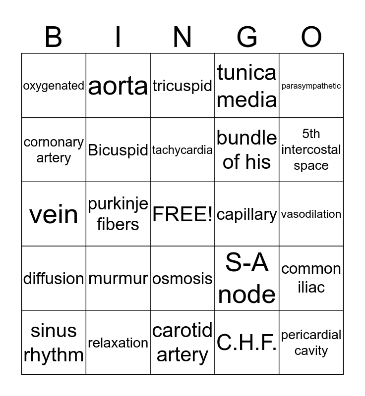 This bingo card has a free space and 34 words: tunica externa, C.H.F., skeletal muscle, Apex, diffusion, Bicuspid, parasympathetic, sinus rhythm, aorta, systolic pressure, tachycardia, tricuspid, baroreceptors, epinephrine, capillary, 5th intercostal space, relaxation, vein, murmur, S-A node, osmosis, epicardium, oxygenated, vasodilation, carotid artery, pericardial cavity, tunica media, endocardium, bundle of his, cornonary artery, mediastinum, purkinje fibers, common iliac and semilunar valves.