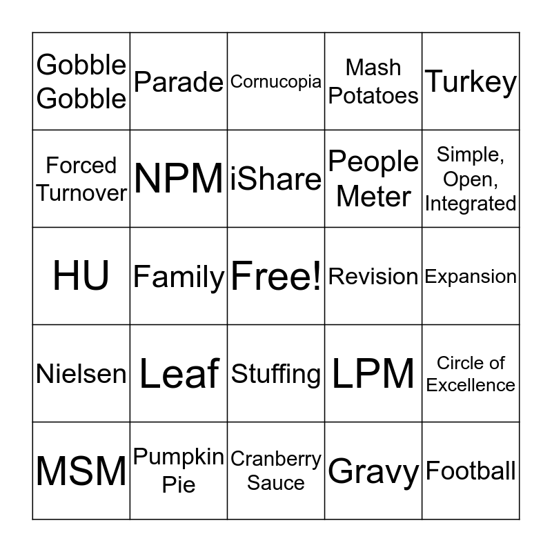 This bingo card has a free space and 24 words: Leaf, Pumpkin Pie, iShare, MSM, Turkey, Gobble Gobble, Forced Turnover, Parade, Revision, Stuffing, People Meter, HU, LPM, Circle of Excellence, NPM, Gravy, Expansion, Cornucopia, Simple, Open, Integrated, Family, Football, Nielsen, Mash Potatoes and Cranberry Sauce.