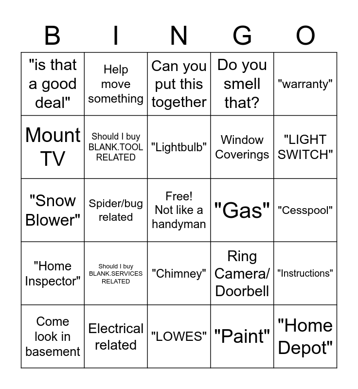 This bingo card has a free space and 29 words: Come look in basement, Plumbing related, Spider/bug related, Shed Related, "is that a good deal", Can you put this together, Should I buy BLANK.TOOL RELATED, Should I buy BLANK.SERVICES RELATED, "Gas", Electrical related, "Cesspool", "Home Depot", "LOWES", "Paint", "LIGHT SWITCH", Lawn care, "Chimney", "Home Inspector", "warranty", "Snow Blower", Ring Camera/ Doorbell, Fiber optic, Window Coverings, Mount TV, Do you smell that?, Help move something, "Instructions", "Lightbulb" and Environmentally Friendly.