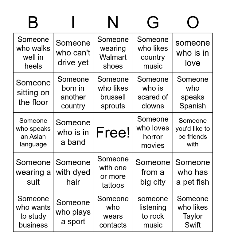 This bingo card has a free space and 34 words: Someone with more than three siblings, someone listening to rock music, Someone who cheats at cards/board games, Someone with an early curfew, Someone wearing a suit, Someone born in another country, someone who is in love, Someone who wants to study business, Someone who can't drive yet, Someone who already has a prom date, Someone who likes brussell sprouts, Someone wearing Walmart shoes, Someone who likes to cook/bake, Someone who really likes the Bee Movie, Someone who loves horror movies, Someone who speaks Spanish, Someone who plays a sport, Someone who speaks an Asian language, Someone with dyed hair, Someone from a big city, Someone with one or more tattoos, Someone who has been in a play/musical, Someone who walks well in heels, Someone you'd like to be friends with, Someone who wears contacts, Someone who likes Taylor Swift, Someone who likes country music, Someone eating lunch, Someone who is scared of clowns, Someone sitting on the floor, Someone with cool rings, Someone who is in a band, Someone who has a pet fish and Someone with a typewriter.