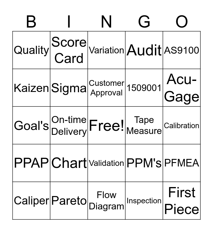 This bingo card has a free space and 29 words: Caliper, Micrometer, On-time Delivery, Customer Satisfaction, Quality, Variation, Sigma, Chart, Tape Measure, Pareto, Calibration, First Piece, Flow Diagram, Inspection, Acu-Gage, Durometer, Validation, PPAP, AS9100, Goal's, PPM's, Value Stream, 1509001, Kaizen, Audit, Score Card, PFMEA, Customer Approval and First Article.