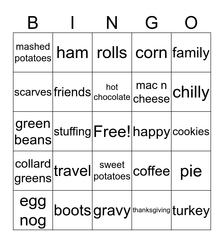 This bingo card has a free space and 24 words: travel, boots, hot chocolate, egg nog, family, mashed potatoes, scarves, ham, happy, sweet potatoes, mac n cheese, green beans, coffee, pie, friends, thanksgiving, cookies, rolls, chilly, stuffing, turkey, collard greens, corn and gravy.