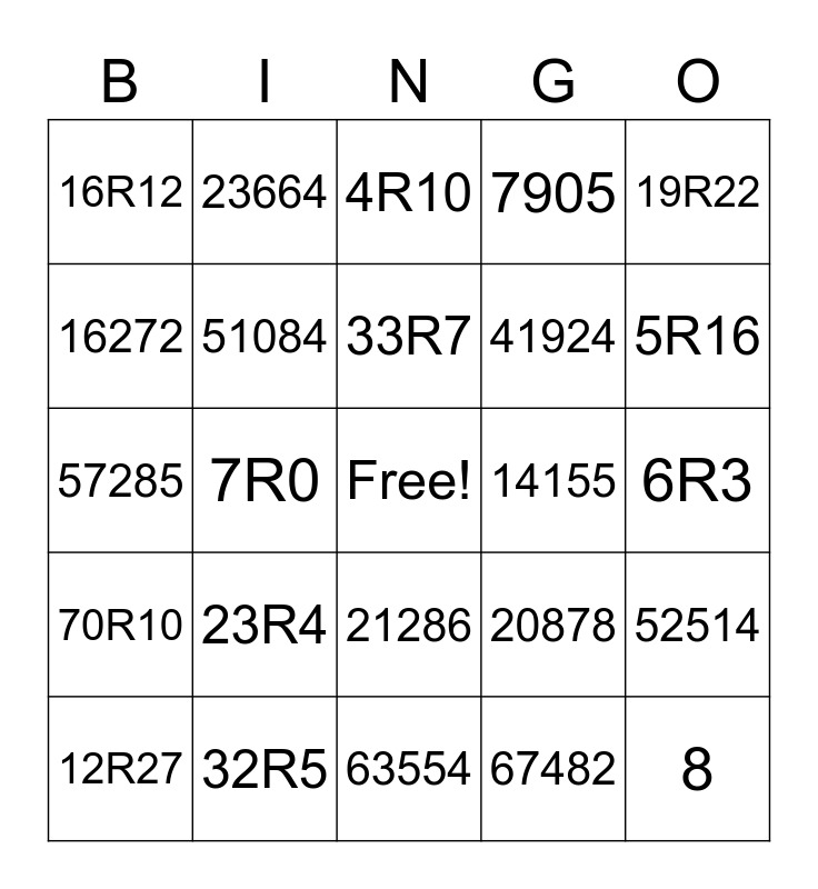 This bingo card has a free space and 24 words: 23R4, 32R5, 33R7, 12R27, 19R22, 16R12, 16272, 23664, 14155, 21286, 41924, 57285, 20878, 52514, 51084, 67482, 6R3, 4R10, 5R16, 7R0, 8, 70R10, 7905 and 63554.
