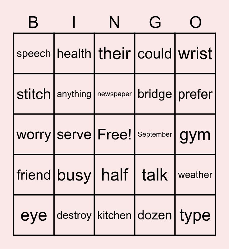 This bingo card has a free space and 32 words: dozen, brother, serve, refer, friend, anything, wrist, weather, health, pie, newspaper, their, threw, February, September, Mrs., eye, worry, half, busy, talk, yesterday, gym, destroy, type, could, bridge, stitch, speech, kitchen, offer and prefer.