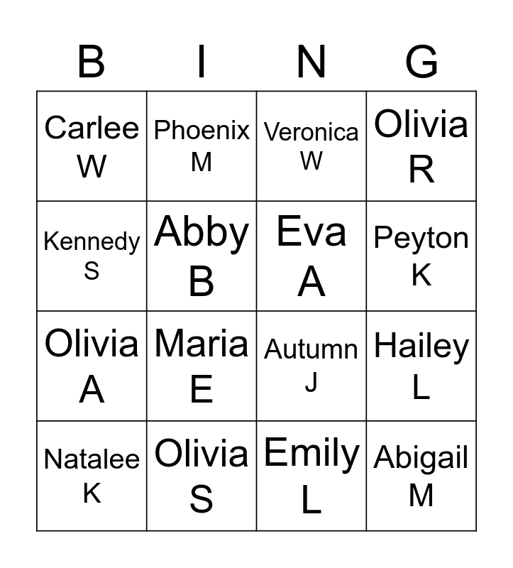 This bingo card has 16 words: Olivia S, Hailey L, Veronica W, Carlee W, Olivia A, Phoenix M, Autumn J, Emily L, Kennedy S, Abby B, Natalee K, Olivia R, Maria E, Peyton K, Eva A and Abigail M.